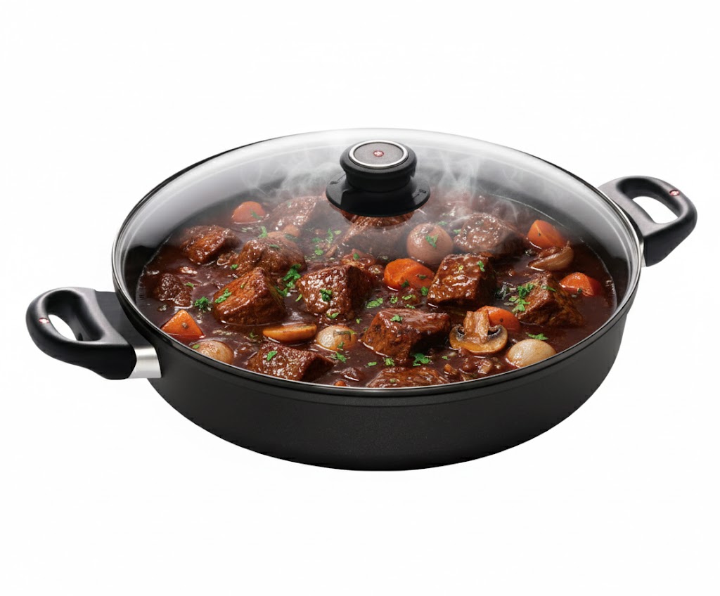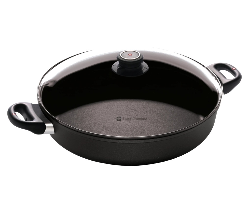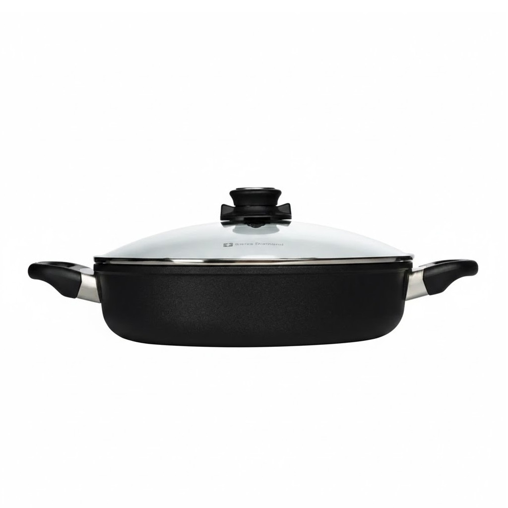 הסיר השטוח הענק בקוטר 32 ס"מ ובנפח 4.5 ליטר מבית Swiss Diamond הוא ה"נשק הסודי" של כל בשלן למנות הדורשות פרזנטציה מרשימה וגישה נוחה במיוחד. המבנה השטוח והרחב שלו תוכנן בקפידה כדי להפוך אותו לכלי הגשה מרכזי במרכז השולחן, המאפשר צמצום מהיר של רטבים, הפיכה קלה של נתחי דג עדינים או קציצות, ושימוש נוח בכף הגשה – מהכיריים או התנור ישירות אל הסועדים.